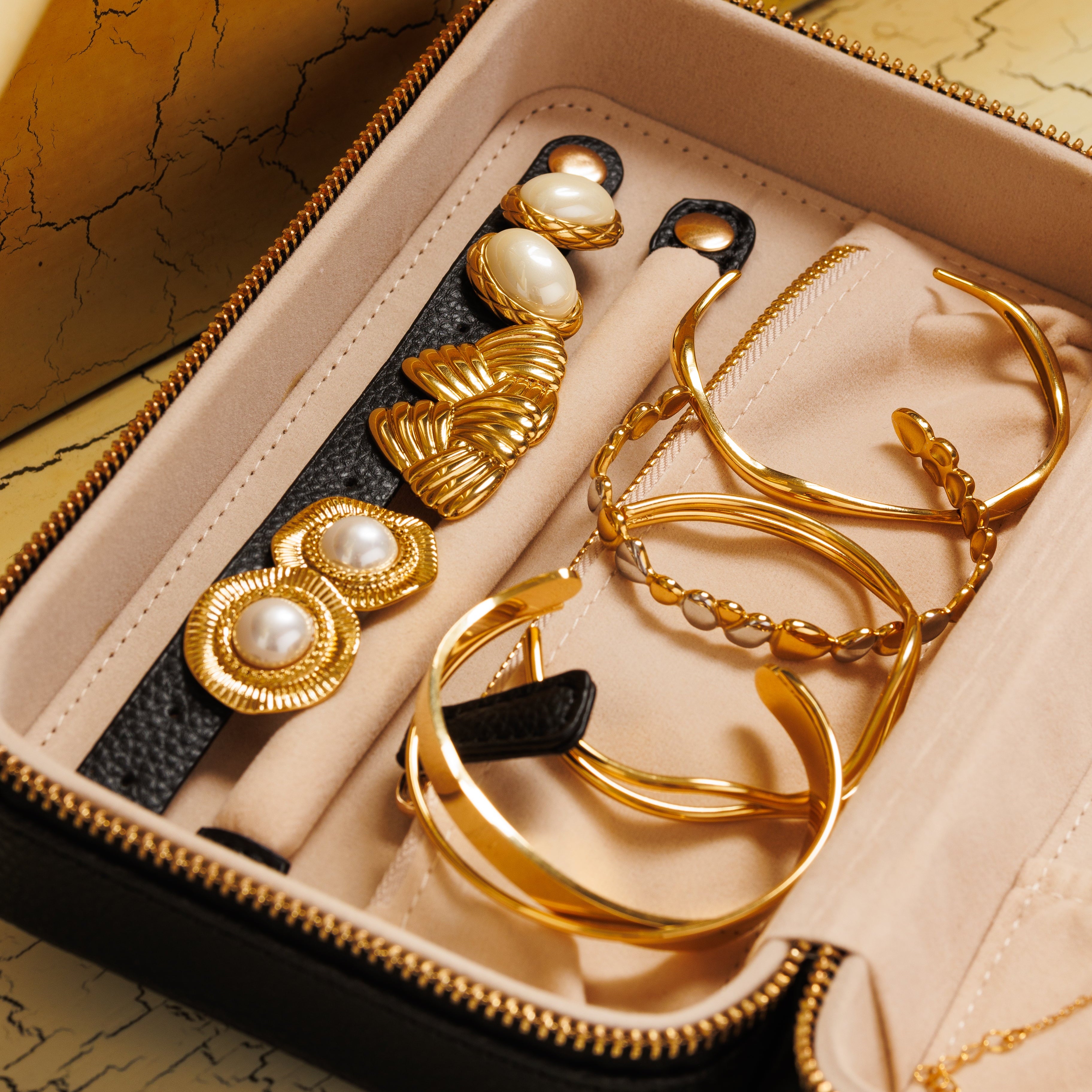 - Made up of two compartments, with a place specially designed to store your rings, earrings, necklaces and earrings finished with a gold zip closure.