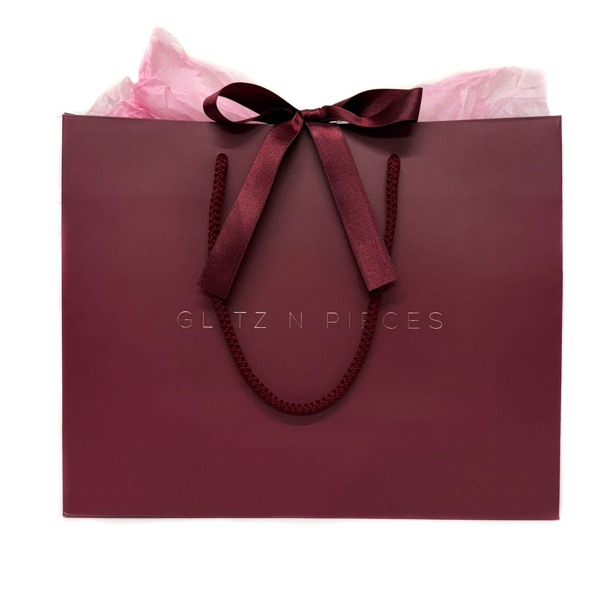 Elevate your gift giving with our signature GLITZ N PIECES Carrier Gift Bag. This luxurious Burgundy and Gold embossed bag features an elegant rope handle and satin ribbon tie, transforming any purchase into a beautifully presented gift. Perfect for adding that final touch of sophistication to your order.