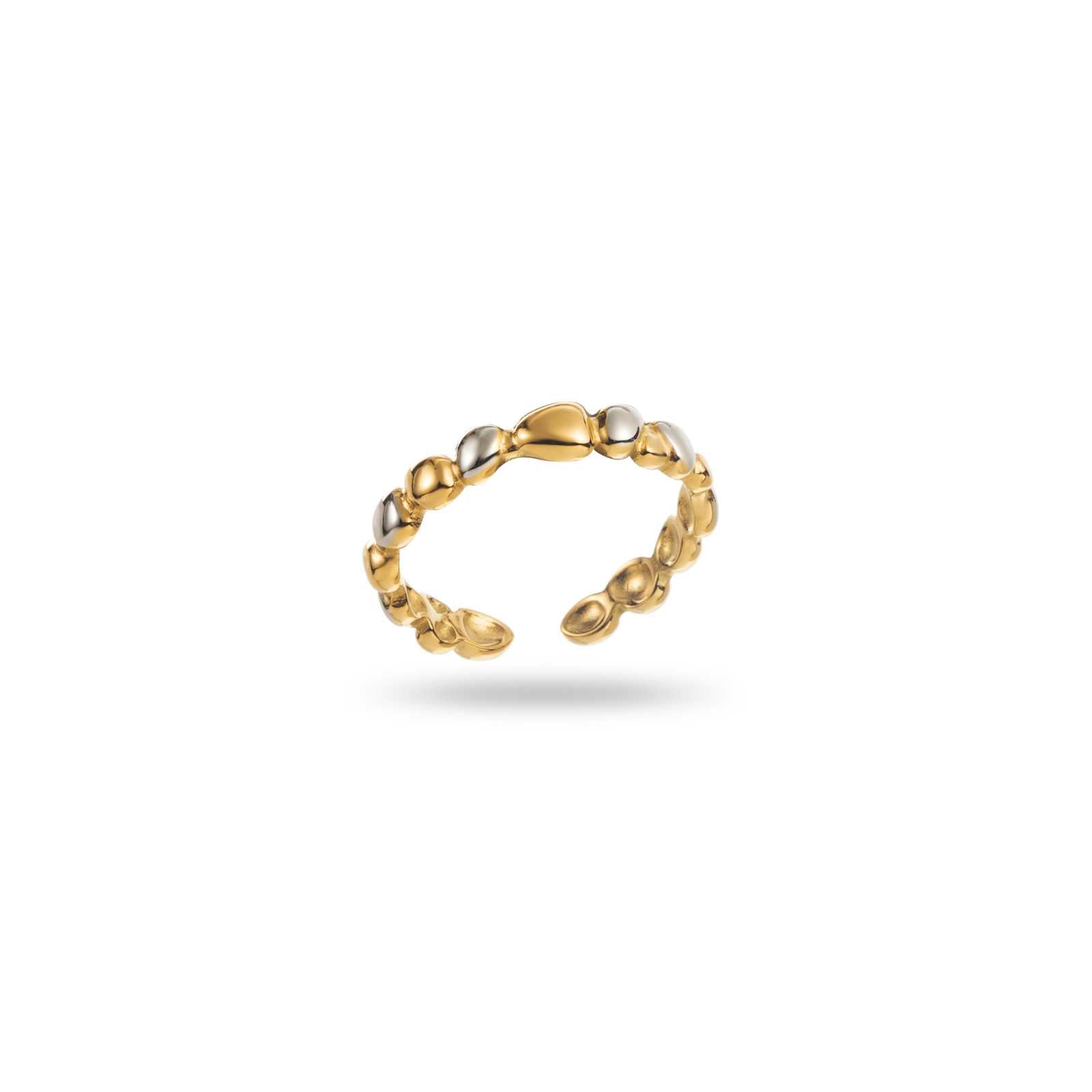 Born from the beloved Ethel Bangle, this sophisticated ring captures the same refined elegance in a delicate form. Crafted from durable stainless steel, it's available in classic gold or a striking gold and silver combination. The adjustable design allows you to customise the fit to your finger with ease, simply pry open and close as needed. Perfect for stacking to create your own unique look, the Ethel Ring transitions seamlessly from day to evening, making it an essential addition to any jewellery collection.